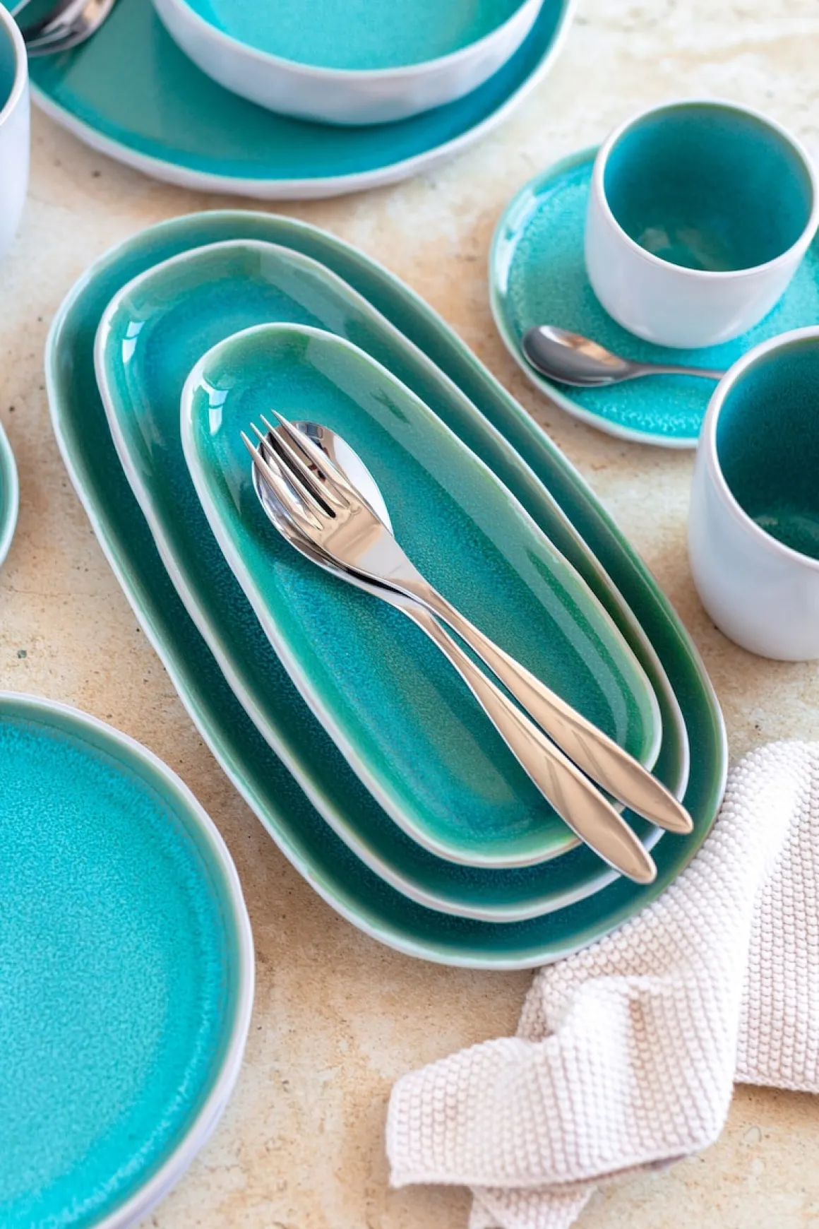 Mit der stilvollen Serie ELEA bringen Sie modernes, harmonisches Flair auf Ihren Esstisch. Die Außenseite in weißer Hammerschlagoptik bildet einen spannenden Kontrast zur türkisfarbenen Reaktivglasur im Inneren – jedes Teil erhält so eine einzigartige Handmade-Optik mit Unikatcharakter.