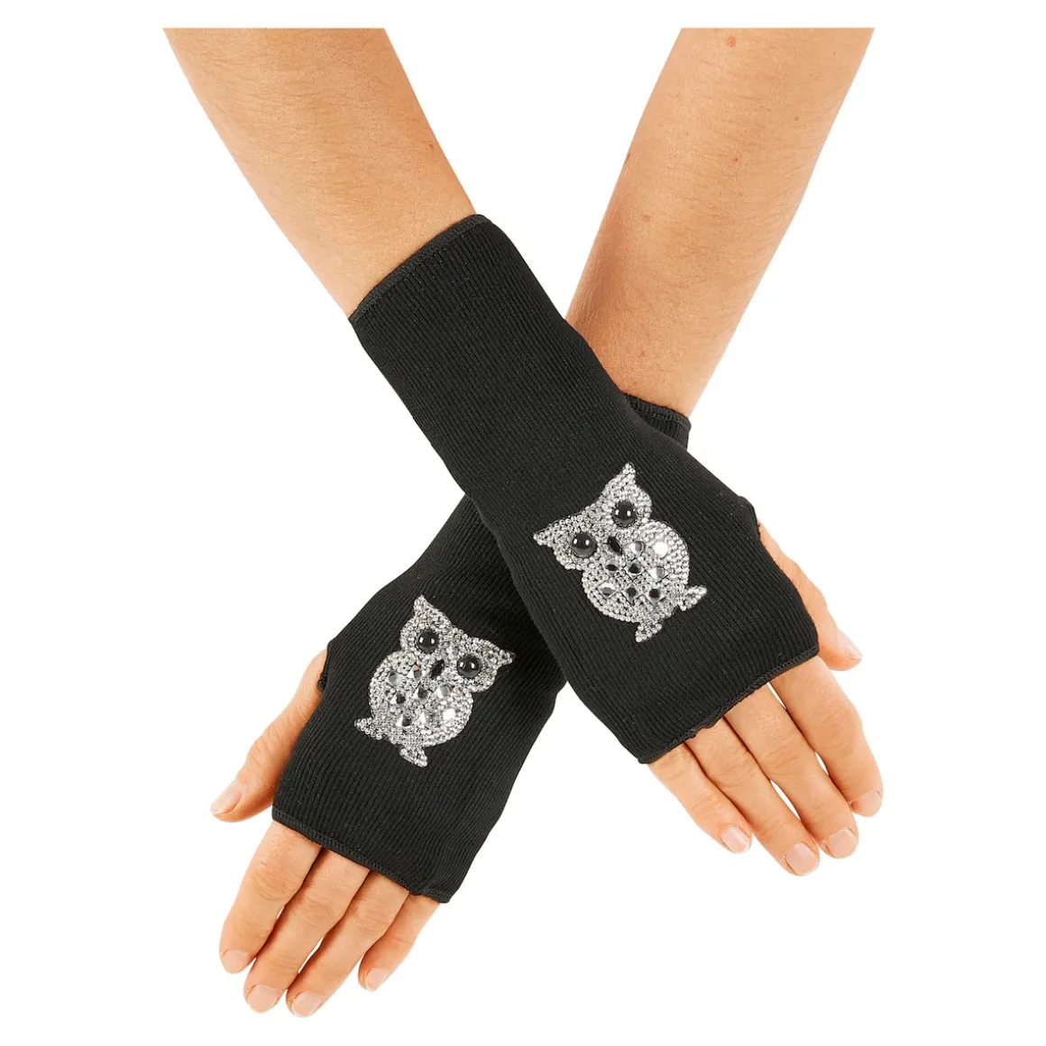 Elastische Pulswärmer, die Dank vieler kleiner Strasssteinchen in Form einer Eule effektvoll glitzern. Innen warm angeraut. Mit Schlupfloch für den Daumen. Einheitsgröße.