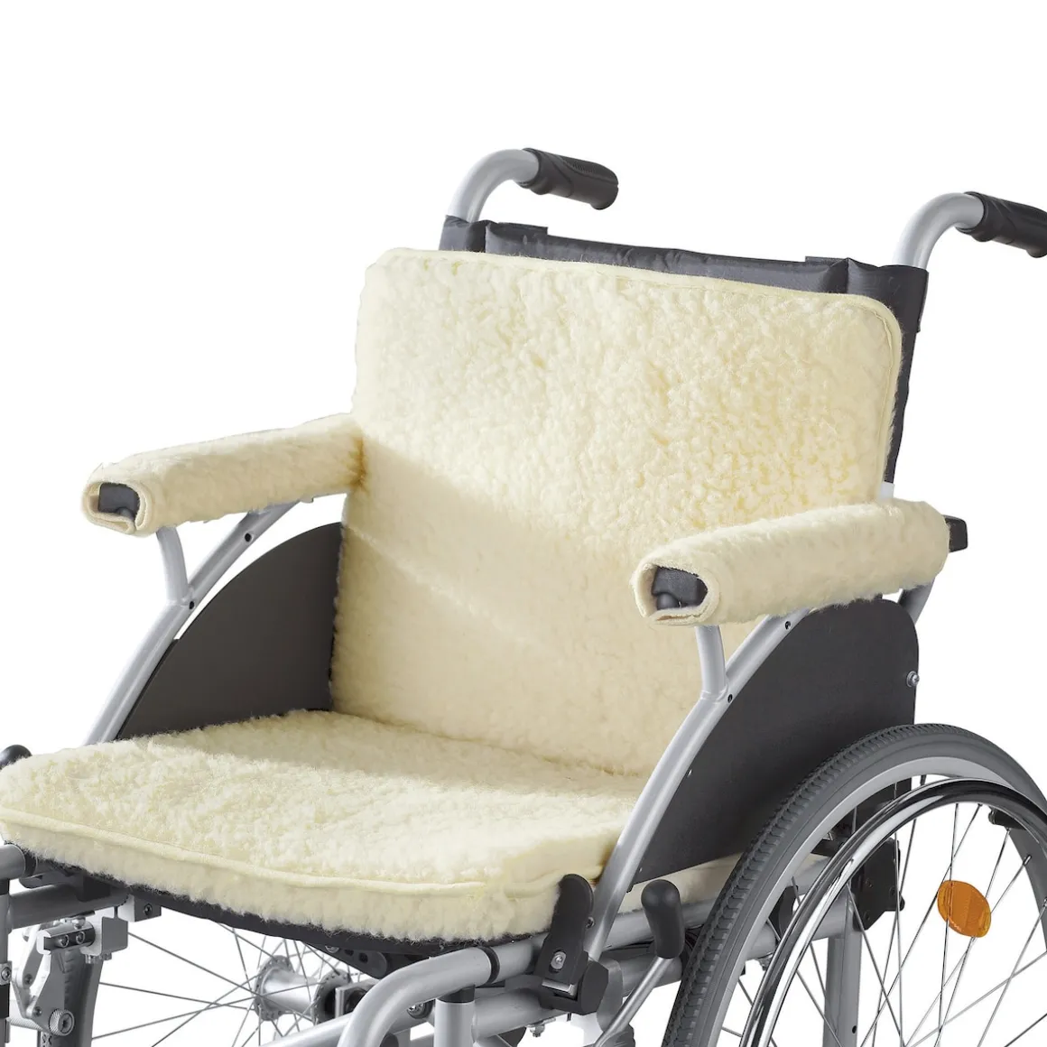 Der Schurwoll-Flor schützt gegen Kälte, der Schaumstoffkern polstert den Rollstuhl. Mit Gummiband an der Rückenlehne fixierbar. Beidseitig verwendbar. 1 Sitz-/Rückenteil und 2 Armauflagen mit variablem Klettverschluss. Armlehnen L: 30 cm.