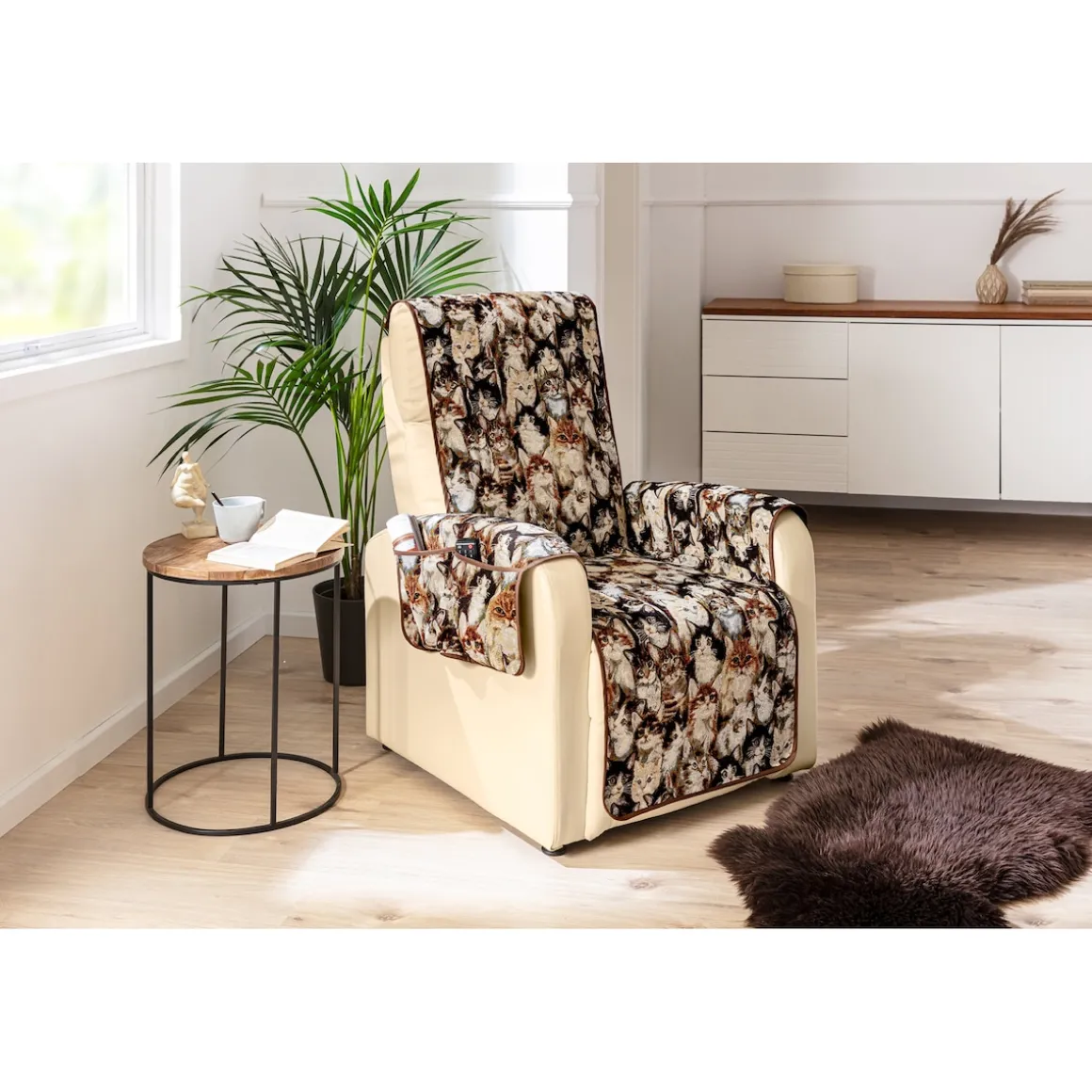 Ganz gleich ob mit oder ohne Tiere im Haushalt – dieser Schoner ist eine sinnvolle Ergänzung! Er schützt Ihren Lieblingssessel vor Verunreinigungen, Tierhaaren und der täglichen Abnutzung. Besonders praktisch: in den Seitentaschen lassen sich Fernbedienung, Brille, Zeitschriften u.v.m. verstauen.