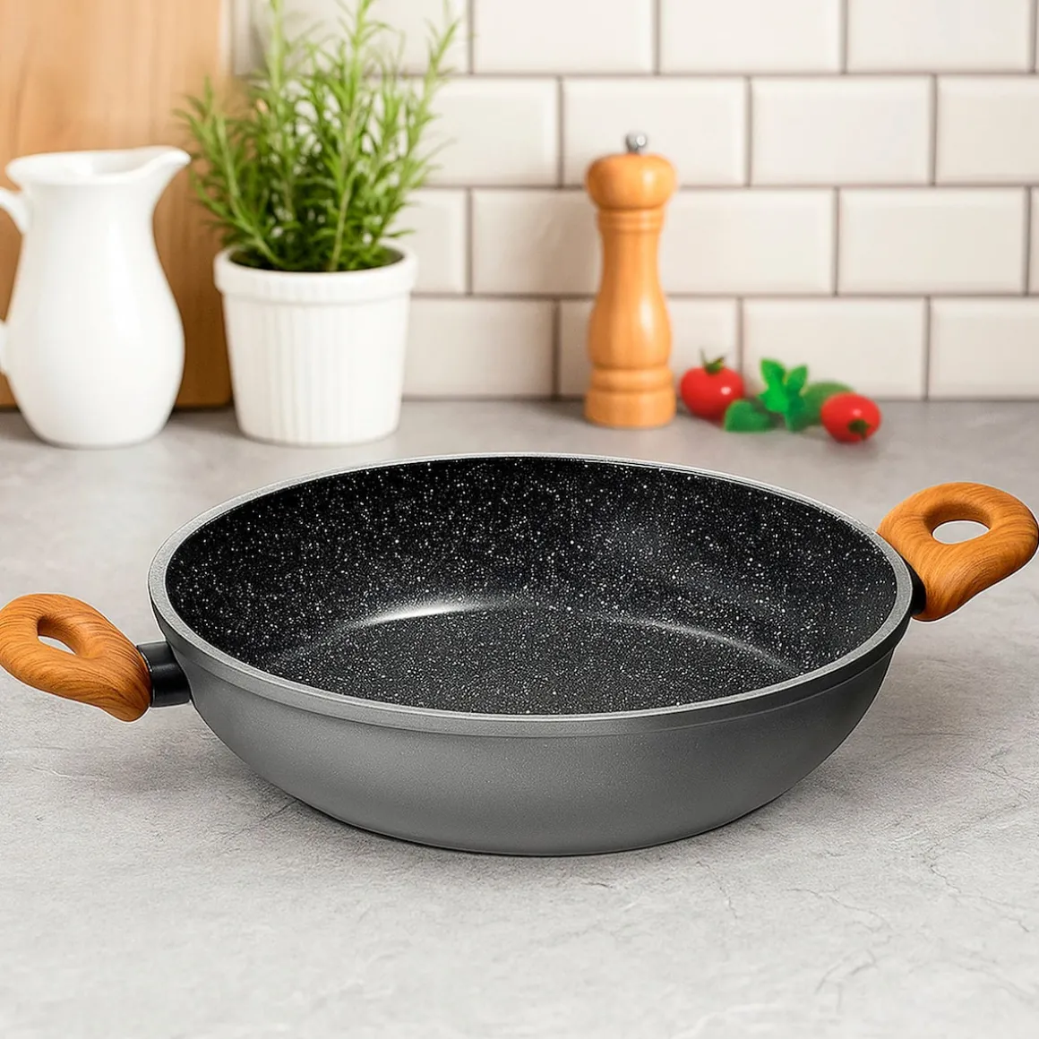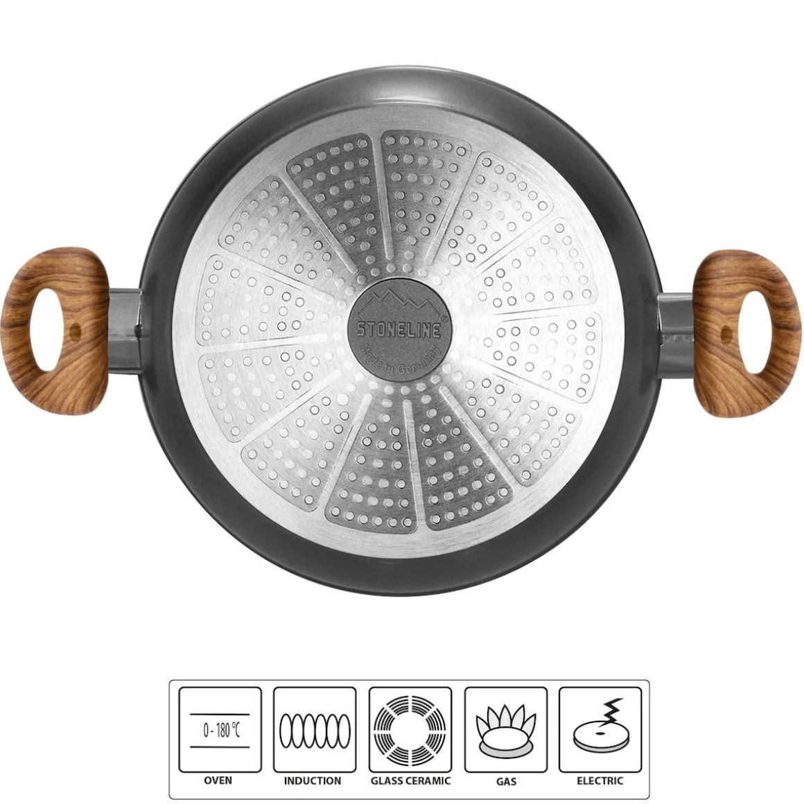STONELINE – Das Original!Gesund fettfrei kochen und braten!Holz ist das angesagte Style-Element, um jedem Küchen-Ambiente einen warmen Akzent zu verleihen und eine beruhigende, ausgeglichene Atmosphäre zu schaffen. Die Back to Nature-Linie von STONELINE vereint diese Eigenschaften. Die Produkte in stilvoller Holzoptik werden selbst auf der gedeckten Tafel zu einem stimmigen Blickfang. Mit dieser Servierpfanne servieren Sie Ihre Speisen ganz einfach vom Herd direkt auf den Tisch! Die beiden praktischen, kurzen Griffe sorgen dafür, dass Sie die große Pfanne auch dann noch im Griff haben, wenn sie gut gefüllt ist. Diese Servierpfanne ersetzt die herkömmliche Servierschüssel. So kommen Ihre Gerichte immer heiß auf den Tisch und bleiben länger heiß. Dank der speziellen STONELINE-Antihaftbeschichtung lassen sich Ihre Speisen – je nach Wunsch – mit oder ohne Bratfett und Ol zubereiten und ganz ohne Ankleben aus dem Kochgeschirr lösen. Hierbei spielt es keine Rolle, ob Sie auf Glaskeramik, Induktion, Elektro oder Gas kochen. In Kochgeschirr mit der original STONELINE-Beschichtung bleiben keine hartnäckigen Reste haften und die einfache Handwäsche spart Ihnen Zeit und Mühe. 1 Servierpfanne, ø ca. 24 cm, Höhe: ca. 5,9 cm, ca. 2,4 l Die wichtigsten Vorteile des STONELINE Kochgeschirrs auf einen Blick: Kratzfeste STONELINE-Antihaftbeschichtung Vitaminschonend kochen und braten ohne Fett und Ol Optimales Bratergebnis und kross gebratenes Fleisch Auch für Vegetarier geeignet: Gemüse bleibt knackig und saftig Kein Anbrennen und kein Ankleben Super leicht zu reinigen Extra starker, verziehfreier Boden Bodenstärke: 4,5 mm Für alle Herdarten geeignet, auch Induktion Backofengeeignet bis 180 °C Material: Aluminium Reinigungs- und Pflegetipps: Vor dem ersten Gebrauch empfehlen wir, Ihr Koch- oder Backgeschirr mit etwas Wasser und einem milden Spülmittel gründlich auszuwaschen.Verteilen Sie anschließend mit einem Papierküchentuch einige Tropfen Speiseöl auf der Beschichtung.Bei der weiteren Nutzung können Sie auf den Einsatz von Fett oder Ol verzichten!Dank dem Easy-Clean-Effekt wird die Reinigung per Hand empfohlen. Einfach mit heißem Wasser, Handspülmittel und einem weichen Schwamm auswischen.