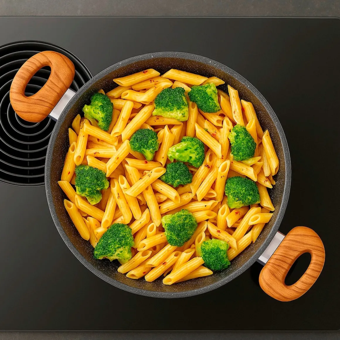 STONELINE – Das Original!Gesund fettfrei kochen und braten!Holz ist das angesagte Style-Element, um jedem Küchen-Ambiente einen warmen Akzent zu verleihen und eine beruhigende, ausgeglichene Atmosphäre zu schaffen. Die Back to Nature-Linie von STONELINE vereint diese Eigenschaften. Die Produkte in stilvoller Holzoptik werden selbst auf der gedeckten Tafel zu einem stimmigen Blickfang. Mit dieser Servierpfanne servieren Sie Ihre Speisen ganz einfach vom Herd direkt auf den Tisch! Die beiden praktischen, kurzen Griffe sorgen dafür, dass Sie die große Pfanne auch dann noch im Griff haben, wenn sie gut gefüllt ist. Diese Servierpfanne ersetzt die herkömmliche Servierschüssel. So kommen Ihre Gerichte immer heiß auf den Tisch und bleiben länger heiß. Dank der speziellen STONELINE-Antihaftbeschichtung lassen sich Ihre Speisen – je nach Wunsch – mit oder ohne Bratfett und Ol zubereiten und ganz ohne Ankleben aus dem Kochgeschirr lösen. Hierbei spielt es keine Rolle, ob Sie auf Glaskeramik, Induktion, Elektro oder Gas kochen. In Kochgeschirr mit der original STONELINE-Beschichtung bleiben keine hartnäckigen Reste haften und die einfache Handwäsche spart Ihnen Zeit und Mühe. 1 Servierpfanne, ø ca. 28 cm, Höhe: ca. 6,4 cm, ca. 3,1 l Die wichtigsten Vorteile des STONELINE Kochgeschirrs auf einen Blick: Kratzfeste STONELINE-Antihaftbeschichtung Vitaminschonend kochen und braten ohne Fett und Ol Optimales Bratergebnis und kross gebratenes Fleisch Auch für Vegetarier geeignet: Gemüse bleibt knackig und saftig Kein Anbrennen und kein Ankleben Super leicht zu reinigen Extra starker, verziehfreier Boden Bodenstärke: 4,5 mm Für alle Herdarten geeignet, auch Induktion Backofengeeignet bis 180 °C Material: Aluminium Reinigungs- und Pflegetipps: Vor dem ersten Gebrauch empfehlen wir, Ihr Koch- oder Backgeschirr mit etwas Wasser und einem milden Spülmittel gründlich auszuwaschen.Verteilen Sie anschließend mit einem Papierküchentuch einige Tropfen Speiseöl auf der Beschichtung.Bei der weiteren Nutzung können Sie auf den Einsatz von Fett oder Ol verzichten!Dank dem Easy-Clean-Effekt wird die Reinigung per Hand empfohlen. Einfach mit heißem Wasser, Handspülmittel und einem weichen Schwamm auswischen.