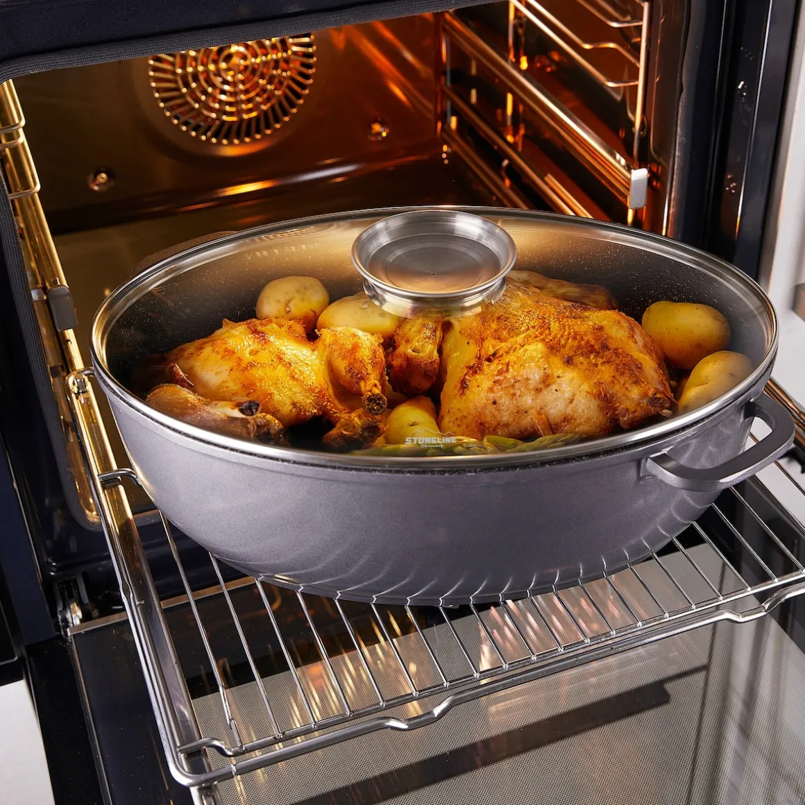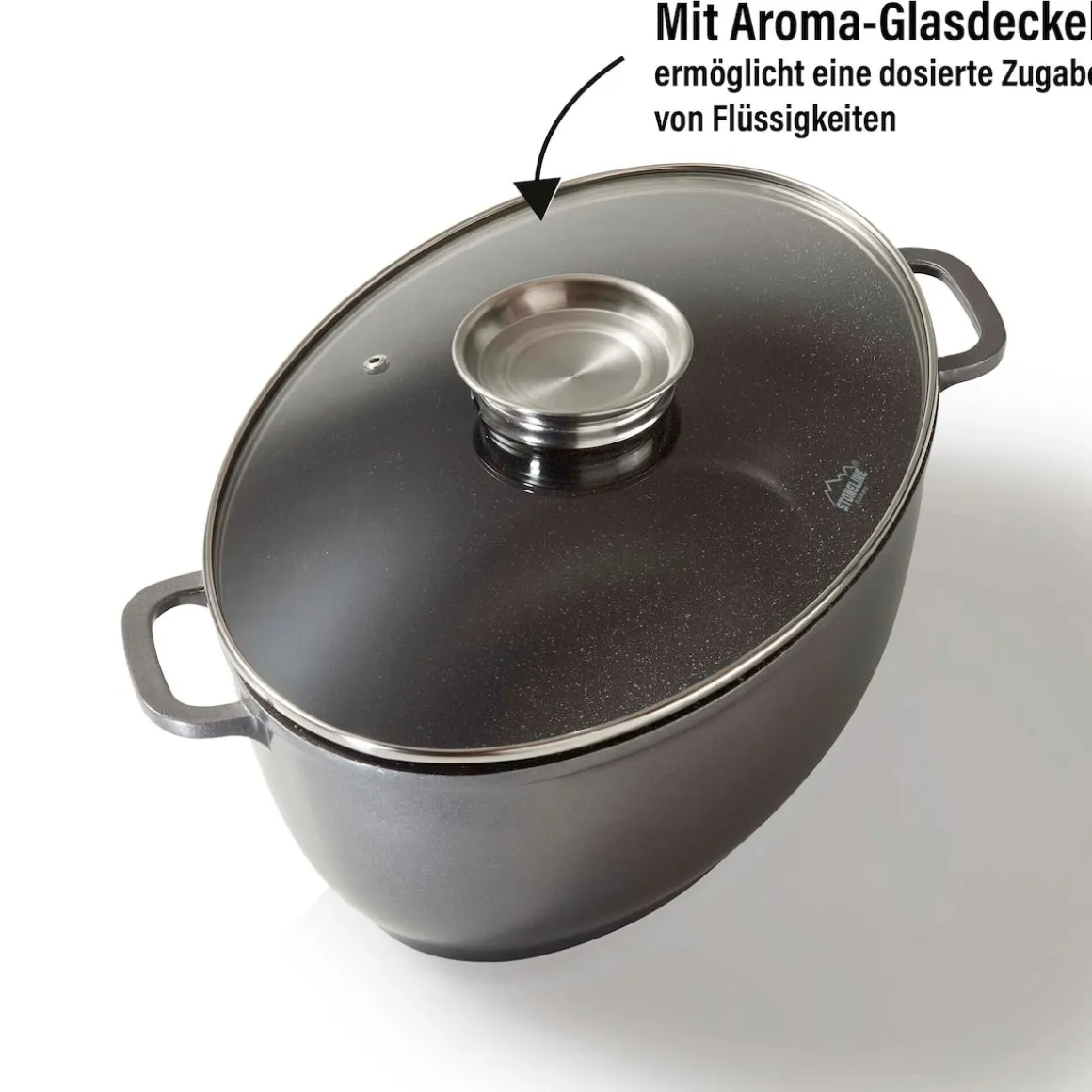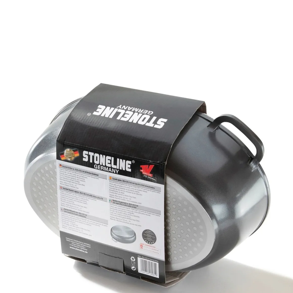 STONELINE – Das Original!Gesund fettfrei kochen und braten! Der ovale Gourmet-Bräter vereint unschlagbare Funktionalität mit zeitlosem Design. Ganz gleich, ob Sie das Kochgeschirr auf dem Herd oder im Backofen verwenden: darin gelingen Ihnen jegliche Gerichte. Der Glasdeckel mit Aroma-Funktion ist eine weitere Zusatzfunktion, die den Bräter zu einem unverzichtbaren Kochgeschirr in Ihrer Küche macht.Fügen Sie über den Aroma-Griff im Glasdeckel Flüssigkeiten wie Wein, flüssige Gewürze oder eine deftige Brühe Ihrem Essen zu. 1 Gourmet-Bräter, ca. 38,8 x 26,3 cm, Höhe: ca. 12,9 cm, ca. 8 l1 Aroma-Glasdeckel, ca. 38,8 x 26,3 cm Die wichtigsten Vorteile des STONELINE Kochgeschirrs auf einen Blick: Weltweit einzige Antihaftbeschichtung mit echten Steinpartikeln Kratzfeste STONELINE-Antihaftbeschichtung Vitaminschonend kochen und braten ohne Fett und Öl Optimales Bratergebnis und kross gebratenes Fleisch Auch für Vegetarier geeignet: Gemüse bleibt knackig und saftig Kein Anbrennen und kein Ankleben Super leicht zu reinigen Extra starker, verzugsfreier Boden Bodenstärke: 4,5 mm Für alle Herdarten geeignet, auch Induktion Backofengeeignet bis 220 °C (ohne Deckel) / 180 °C (mit Deckel) Material: Aluminiumguss Reinigungs- und Pflegetipps: Vor dem ersten Gebrauch empfehlen wir, Ihr Koch- oder Backgeschirr mit etwas Wasser und einem milden Spülmittel gründlich auszuwaschen.Verteilen Sie anschließend mit einem Papierküchentuch einige Tropfen Speiseöl auf der Beschichtung.Bei der weiteren Nutzung können Sie auf den Einsatz von Fett oder Öl verzichten!Dank dem Easy-Clean-Effekt wird die Reinigung per Hand empfohlen. Einfach mit heißem Wasser, Handspülmittel und einem weichen Schwamm auswischen.