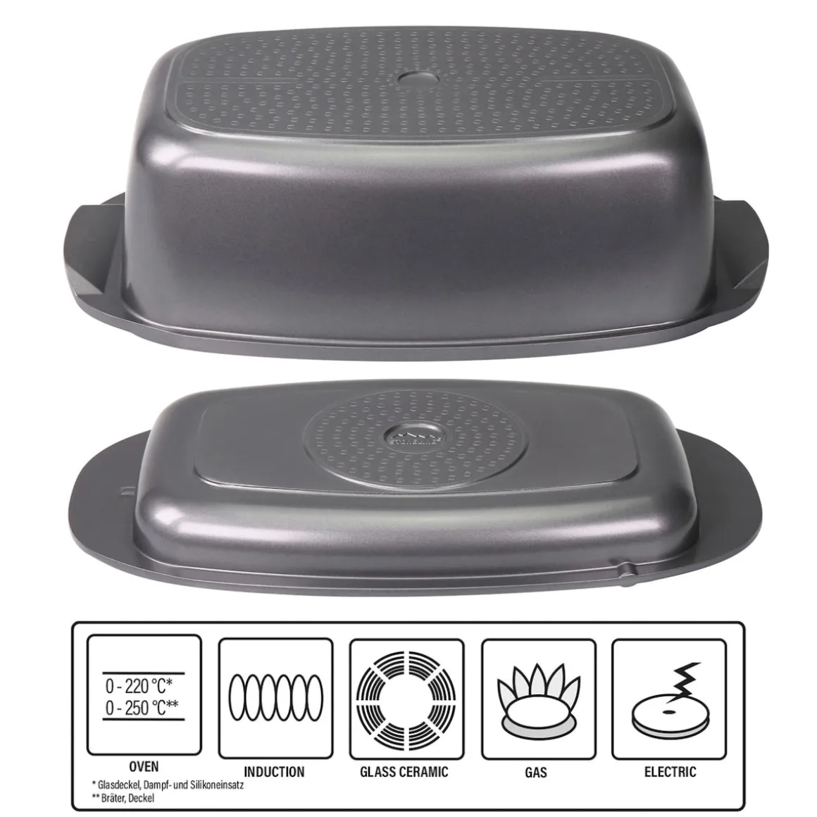 STONELINE – Das Original! Gesund fettfrei kochen und braten! Das STONELINE Koch- und Back-Set vereint mehrere Funktionen und ist für eine Vielzahl an Zubereitungsmethoden geeignet. Das Komplettset enthält alles, was du zum Kochen, Braten, Grillen, Schmoren, Dämpfen und Backen brauchst. Ideal für alle, die ihre Küche flexibel und praktisch ausstatten möchten. Aluguss Bräter – Vielseitiger Allrounder Der Aluguss Bräter bietet mit einem Volumen von knapp 6 Litern genug Platz für große Braten, Gulasch oder Eintöpfe. Er eignet sich für alle gängigen Herdarten, einschließlich Induktion, und garantiert eine gleichmäßige Wärmeverteilung. Der Bräter ist ebenso backofengeeignet, sodass du ihn nicht nur zum Braten, sondern auch für Aufläufe, Gratins oder zum Brotbacken verwenden kannst. Aluguss Deckel – Passgenau und praktisch Der Aluguss Deckel ist ebenfalls aus robustem Material gefertigt und passgenau für den Bräter. Mit einem Volumen von knapp 2 Litern kann der Deckel auch separat als Grillplatte oder im Backofen als Auflaufform verwendet werden. Die Induktionsfläche von ca. 12 cm passt perfekt auf die kleineren Kontaktflächen von Induktionsherden und das hochwertige Material sorgt für ein schnelles Erhitzen – selbstverständlich auf allen Herdarten. Aluminium-Dampfeinsatz – Dämpfen und backen Der Dampfeinsatz aus Aluminium bietet nicht nur die Möglichkeit, Gemüse, Fisch oder andere Lebensmittel schonend zu dämpfen, sondern er kann auch als Backform verwendet werden. Durch das Einlegen der Silikonmatte in den Aluminium Dämpfer besitzt dieser einen durchgängigen Boden. So lassen sich Kuchen, Aufläufe oder Brote zubereiten. Silikonmatte – Multifunktional und praktisch Die Silikonmatte lässt sich vielseitig einsetzen. Sie dient als Einlage für den Dampfeinsatz, um diesen zur Backform umzufunktionieren, kann aber auch als Backmatte verwendet werden. Einfach anstelle von Backpapier auf dem Ofenrost verwenden und du kannst deine Speisen nach der Zubereitung ohne Anhaften ablösen. Genauso einfach funktioniert es auch in der Backform: die Silikonmatte erleichtert das Herauslösen deiner Backkreationen. Glasdeckel / Schneidunterlage – Zwei in Eins Der Deckel aus gehärtetem Glas kann nicht nur zum Schließen des Bräters oder des Alugussdeckels verwendet werden, sondern dient auch als Schneidunterlage. Mit den Maßen ca. 31,5 x 20 cm bietet der Deckel eine stabile Fläche für das Schneiden, Zerkleinern, Anrichten und Servieren von Zutaten. Besonders praktisch, wenn du die Zubereitung von Speisen in deiner Küche auf verschiedenen Flächen durchführen möchtest, ohne dass eine zusätzliche Unterlage benötigt wird. Rundherum ist der Glasdeckel bzw. das Schneidebrett mit einem Silikonrand versehen, damit er beim Herunterfallen bruchsicherer ist. Dank der speziellen STONELINE-Antihaftbeschichtung lassen sich Ihre Speisen – je nach Wunsch – mit oder ohne Bratfett und Öl zubereiten und ganz ohne Ankleben aus dem Kochgeschirr lösen. Hierbei spielt es keine Rolle, ob Sie auf Glaskeramik, Induktion, Elektro oder Gas kochen. In Kochgeschirr mit der original STONELINE-Beschichtung bleiben keine hartnäckigen Reste haften und die einfache Handwäsche spart Ihnen Zeit und Mühe. Dieses 5-teilige Set besteht aus: 1 Aluguss-Bräter, ca. 39,2 x 22,2 cm, Höhe: ca. 11 cm, ca. 5,9 I, Induktionsfläche: ca. 25,2 x 14,4 cm 1 Aluguss-Deckel, ca. 39,2 x 22,2 cm, Höhe: ca. 4,3 cm, ca. 1,8 I, Induktionsfläche: ca. 12 cm 1 Aluminium-Dampfeinsatz, ca. 31,5 x 20 cm, Höhe: ca. 6,5 cm, auch als Backform verwendbar 1 Silikonmatte, ca. 31,5 x 20 cm, Höhe: ca. 1,5 cm, auch als Einlage für den Dampfeinsatz verwendbar, so dass dieser zur Backform wird 1 Glasdeckel, ca. 31,5 x 20 cm, Höhe: ca. 2 cm, auch als Schneidunterlage oder Servierplatte verwendbar Die wichtigsten Vorteile auf einen Blick: Weltweit einzige Antihaftbeschichtung mit echten Steinpartikeln Kratzfeste STONELINE-Antihaftbeschichtung Vitaminschonend kochen und braten ohne Fett und Öl Optimales Bratergebnis und kross gebratenes