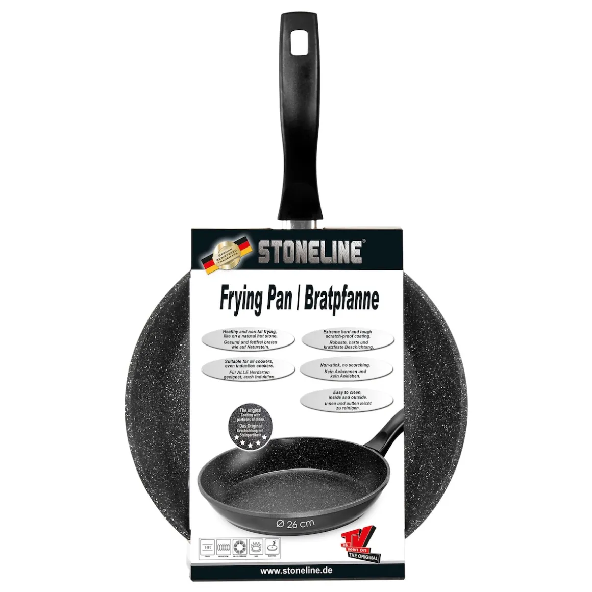 STONELINE – Das Original! Gesund fettfrei kochen und braten!Diese Pfanne mit einem Durchmesser von 26 cm ist nicht zu klein und nicht zu groß.Bereiten Sie darin große oder kleine Mengen zu, ohne dass diese am Pfannenboden anhaften oder ankleben.Diese Bratpfanne ist für alle Herdarten geeignet, auch für Induktion. 1 Bratpfanne, Ø ca. 26 cm, Höhe: ca. 4,5 cm, ca. 1,8 l Die wichtigsten Vorteile des STONELINE Kochgeschirrs auf einen Blick: Weltweit einzige Antihaftbeschichtung mit echten Steinpartikeln Kratzfeste STONELINE-Antihaftbeschichtung Optimales Bratergebnis und kross gebratenes Fleisch Bester Geschmack Vitaminschonend kochen und braten ohne Fett und Öl Kein Anbrennen und kein Ankleben Super leicht zu reinigen für alle Herdarten geeignet, auch Induktion Extra starker, verzugfreier Boden Bodenstärke 4,5 mm Dieses Produkt ist backofengeeignet bis 180 °C Material: Aluminiumguss Reinigungs- und Pflegetipps: Vor dem ersten Gebrauch empfehlen wir, Ihr Kochgeschirr mit etwas Wasser und einem milden Spülmittel gründlich auszuwaschen. Verteilen Sie anschließend mit einem Papierküchentuch einige Tropfen Speiseöl auf der Beschichtung. Bei der weiteren Nutzung können Sie auf den Einsatz von Fett oder Öl verzichten! Dank dem Easy-Clean-Effekt wird die Reinigung per Hand empfohlen. Einfach mit heißem Wasser, Handspülmittel und einem weichen Schwamm auswischen.