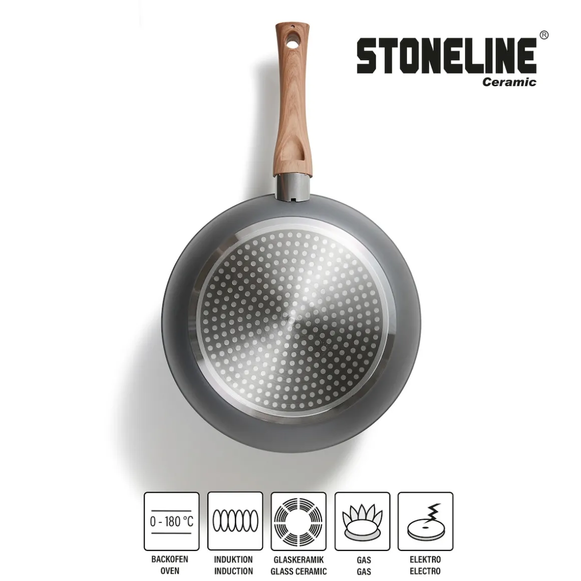Die geniale STONELINE Beschichtung nun auch in Keramik-Ausführung! Gesundes, vitaminschonendes Kochen mit wenig Fett Der Topseller unter den Kochgeschirr-Sets, der Ihrer Küche einen wahren Mehrwert gibt. Für jeden Anlass das passende Kochgeschirr zur Hand – damit erleichtern Sie sich das Leben in der Küche und sorgen für ein unbegrenztes Kochvergnügen. Dank der extrem harten, langlebigen STONELINE CERAMIC Beschichtung mit Lotus Abperl-Effekt werden Sie zukünftig noch mehr Freude beim Zubereiten Ihrer Speisen haben! Hierbei spielt es keine Rolle, ob Sie auf Glaskeramik, Induktion, Elektro oder Gas kochen. Dieses 14-teilige Set besteht aus: 1 Kochtopf, ø ca. 18 cm, Höhe: ca. 7,5 cm, ca. 1,8 l 1 Kochtopf, ø ca. 20 cm, Höhe: ca. 8,5 cm, ca. 2,6 l 1 Kochtopf, ø ca. 24 cm, Höhe: ca. 11,0 cm, ca. 4,2 l 1 Bratpfanne, ø ca. 18 cm, Höhe: ca. 4,0 cm, ca. 0,8 l 1 Bratpfanne, ø ca. 20 cm, Höhe: ca. 4,3 cm, ca. 1,0 l 1 Bratpfanne, ø ca. 24 cm, Höhe: ca. 4,7 cm, ca. 1,7 l 1 Glasdeckel, ø ca. 24 cm 1 Glasdeckel, ø ca. 20 cm 1 Glasdeckel, ø ca. 18 cm 2 Vliespfannenschützer, ø ca. 38 cm 1 Schaber, ca. 28 x 5,7 x 2 cm 1 Kochlöffel, ca. 28,5 x 6 x 2 cm 1 Suppenkelle, ca. 27,5 x 8,5 x 2 cm Die wichtigsten Vorteile des STONELINE CERAMIC Kochgeschirrs auf einen Blick: Kratzfeste STONELINE- Keramikbeschichtung Optimales Bratergebnis und kross gebratenes Fleisch Bester Geschmack Vitaminschonend kochen und braten mit wenig Fett und Öl Kein Anbrennen und kein Ankleben Super leicht zu reinigen Für alle Herdarten geeignet, auch Induktion Extra starker, verzugsfreier Boden Beschichtung hitzebeständig bis 450 °C Zum Flambieren geeignet Bodenstärke Pfannen: 4 mm Bodenstärke Töpfe: 3 mm Backofengeeignet bis 180 °C Material: Aluminium Reinigungs- und Pflegetipps: Vor dem ersten Gebrauch empfehlen wir, Ihr Koch- oder Backgeschirr mit etwas Wasser und einem milden Spülmittel gründlich auszuwaschen. Verteilen Sie anschließend mit einem Papierküchentuch einige Tropfen Speiseöl auf der Beschichtung. Dank dem Easy-Clean-Effekt wird die Reinigung per Hand empfohlen. Einfach mit heißem Wasser, Handspülmittel und einem weichen Schwamm auswischen.