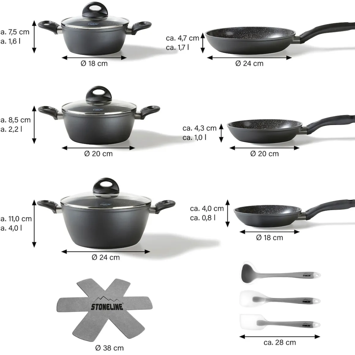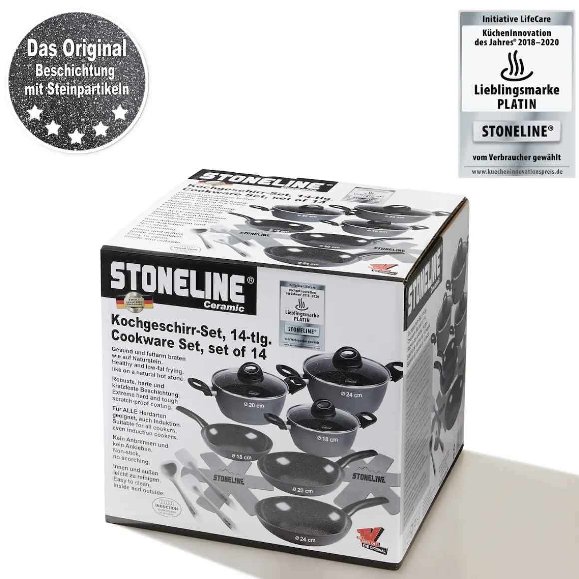 Die geniale STONELINE Beschichtung nun auch in Keramik-Ausführung!Gesundes, vitaminschonendes Kochen mit wenig Fett Der Topseller unter den Kochgeschirr-Sets, der Ihrer Küche einen wahren Mehrwert gibt.Für jeden Anlass das passende Kochgeschirr zur Hand – damit erleichtern Sie sich das Leben in der Küche und sorgen für ein unbegrenztes Kochvergnügen. Dank der extrem harten, langlebigen STONELINE CERAMIC Beschichtung mit Lotus Abperl-Effekt werden Sie zukünftig noch mehr Freude beim Zubereiten Ihrer Speisen haben! Hierbei spielt es keine Rolle, ob Sie auf Glaskeramik, Induktion, Elektro oder Gas kochen. Dieses 14-teilige Set besteht aus: 1 Kochtopf, ø ca. 18 cm, Höhe: ca. 7,5 cm, ca. 1,8 l1 Kochtopf, ø ca. 20 cm, Höhe: ca. 8,5 cm, ca. 2,6 l1 Kochtopf, ø ca. 24 cm, Höhe: ca. 11 cm, ca. 4,2 l1 Bratpfanne, ø ca. 18 cm, Höhe: ca. 4,0 cm, ca. 0,8 l1 Bratpfanne, ø ca. 20 cm, Höhe: ca. 4,3 cm, ca. 1,0 l1 Bratpfanne, ø ca. 24 cm, Höhe: ca. 4,7 cm, ca. 1,7 l1 Glasdeckel, ø ca. 24 cm1 Glasdeckel, ø ca. 20 cm1 Glasdeckel, ø ca. 18 cm2 Vliespfannenschützer, ø ca. 38 cm1 Schaber, ca. 28 x 5,7 x 2 cm1 Kochlöffel, ca. 28,5 x 6 x 2 cm1 Suppenkelle, ca. 27,5 x 8,5 x 2 cm Die wichtigsten Vorteile des STONELINE CERAMIC Kochgeschirrs auf einen Blick: Kratzfeste STONELINE- Keramikbeschichtung Optimales Bratergebnis und kross gebratenes Fleisch Bester Geschmack Vitaminschonend kochen und braten mit wenig Fett und Öl Kein Anbrennen und kein Ankleben Super leicht zu reinigen Für alle Herdarten geeignet, auch Induktion Extra starker, verzugsfreier Boden Beschichtung hitzebeständig bis 450 °C Zum Flambieren geeignet Bodenstärke Pfannen: 4 mm Bodenstärke Töpfe: 3 mm Backofengeeignet bis 180 °C Material: Aluminium Reinigungs- und Pflegetipps: Vor dem ersten Gebrauch empfehlen wir, Ihr Koch- oder Backgeschirr mit etwas Wasser und einem milden Spülmittel gründlich auszuwaschen.Verteilen Sie anschließend mit einem Papierküchentuch einige Tropfen Speiseöl auf der Beschichtung.Dank dem Easy-Clean-Effekt wird die Reinigung per Hand empfohlen. Einfach mit heißem Wasser, Handspülmittel und einem weichen Schwamm auswischen.
