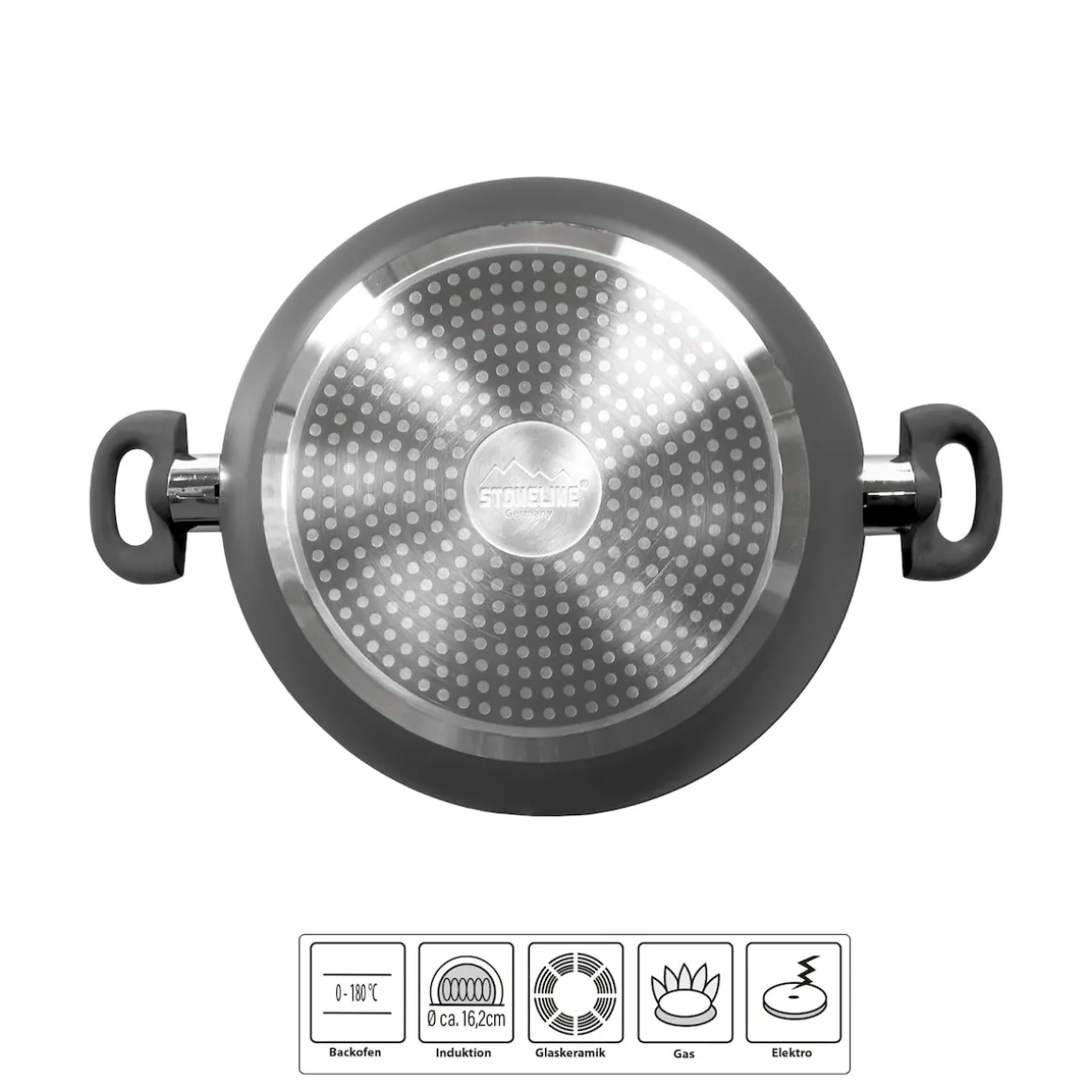 Die geniale STONELINE Beschichtung nun auch in Keramik-Ausführung!Gesundes, vitaminschonendes Kochen mit wenig Fett Mit dieser Servierpfanne servieren Sie Ihre Speisen ganz einfach vom Herd direkt auf den Tisch!Die beiden praktischen, kurzen Griffe sorgen dafür, dass Sie die große Pfanne auch dann noch im Griff haben, wenn sie gut gefüllt ist.Diese Servierpfanne ersetzt die herkömmliche Servierschüssel.So kommen Ihre Gerichte immer heiß auf den Tisch und bleiben länger heiß. Der einzigartige Aroma-Glasdeckel ermöglicht eine dosierte Zugabe von Flüssigkeiten wie z. B. Wein, flüssige Gewürze oder andere Essenzen über den Deckelknauf. So erhalten Ihre verfeinerten Speisen den unverkennbaren Geschmack der zugegebenen Aromen. Dank der extrem harten, langlebigen STONELINE CERAMIC Beschichtung mit Lotus Abperl-Effekt werden Sie zukünftig noch mehr Freude beim Zubereiten Ihrer Speisen haben! Hierbei spielt es keine Rolle, ob Sie auf Glaskeramik, Induktion, Elektro oder Gas kochen. 1 Servierpfanne, ø ca. 24 cm, Höhe: ca. 6,5 cm, ca. 2,4 l1 Aroma-Glasdeckel, ø ca. 24 cm Die wichtigsten Vorteile des STONELINE CERAMIC Kochgeschirrs auf einen Blick: Kratzfeste STONELINE- Keramikbeschichtung Optimales Bratergebnis und kross gebratenes Fleisch Bester Geschmack Vitaminschonend kochen und braten mit wenig Fett und Öl Kein Anbrennen und kein Ankleben Super leicht zu reinigen Für alle Herdarten geeignet, auch Induktion Extra starker, verzugsfreier Boden Beschichtung hitzebeständig bis 450 °C Zum Flambieren geeignet Bodenstärke: 3 mm Backofengeeignet bis 180 °C Material: AluminiumPFAS frei Reinigungs- und Pflegetipps: Vor dem ersten Gebrauch empfehlen wir, Ihr Koch- oder Backgeschirr mit etwas Wasser und einem milden Spülmittel gründlich auszuwaschen.Verteilen Sie anschließend mit einem Papierküchentuch einige Tropfen Speiseöl auf der Beschichtung.Dank dem Easy-Clean-Effekt wird die Reinigung per Hand empfohlen. Einfach mit heißem Wasser, Handspülmittel und einem weichen Schwamm auswischen.