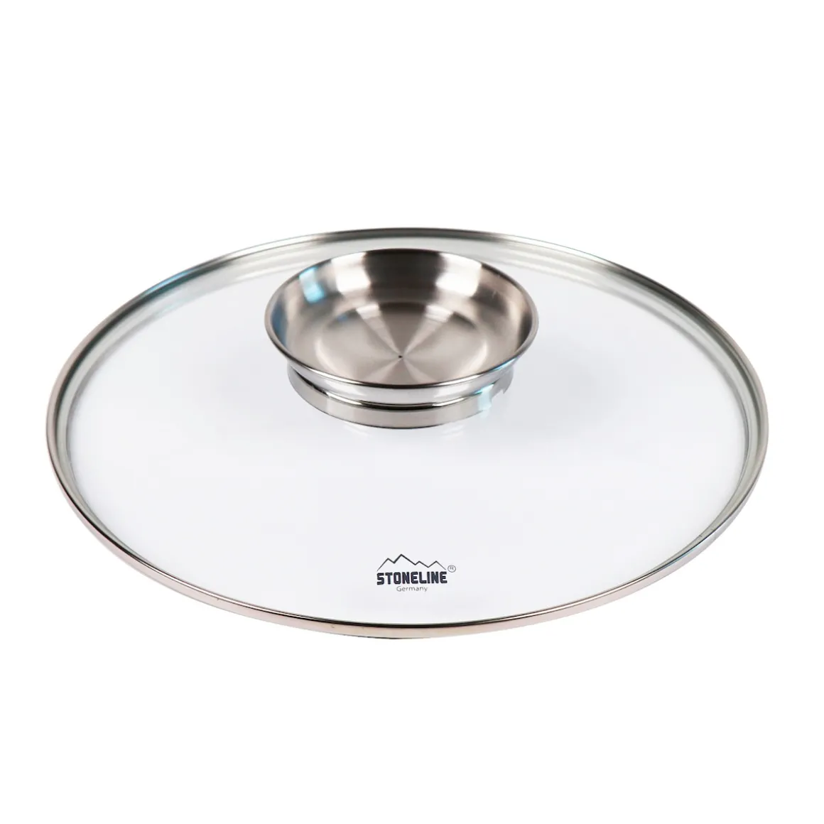 STONELINE – Das original! Aroma-Glasdeckel mit Edelstahlrand Ermöglicht eine dosierte Zugabe von Flüssigkeiten über den Deckelknauf Passend für Töpfe und Pfannen der Marke STONELINE und weitere ø ca. 24 cm Mit Abdampfventil