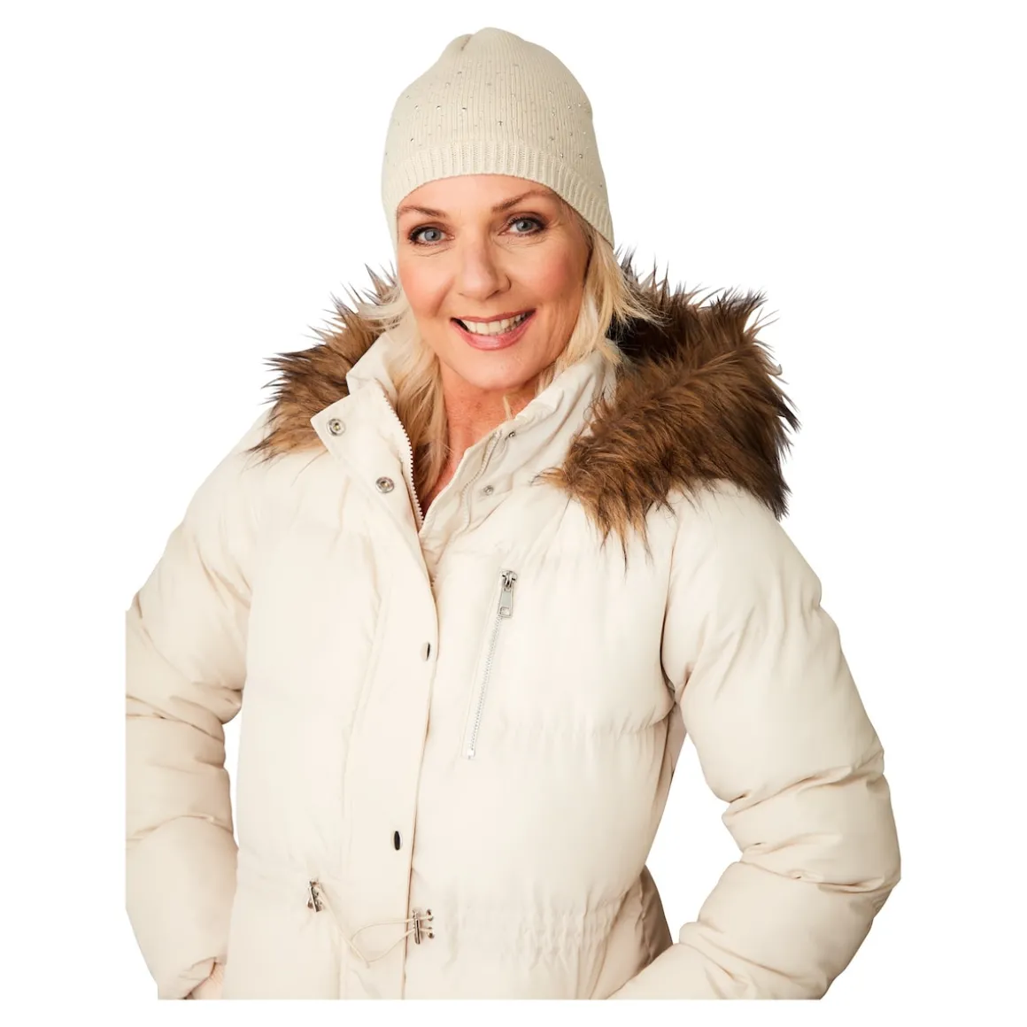 Wie Sterne in der Winternacht funkeln die Glitzersteinchen dieser zauberhaften Strickmütze. Die Mütze ist über und über mit glitzernden Steinchen besetzt. Ein stylisches Must-have gegen Winterfrost, das lange Freude bereitet.