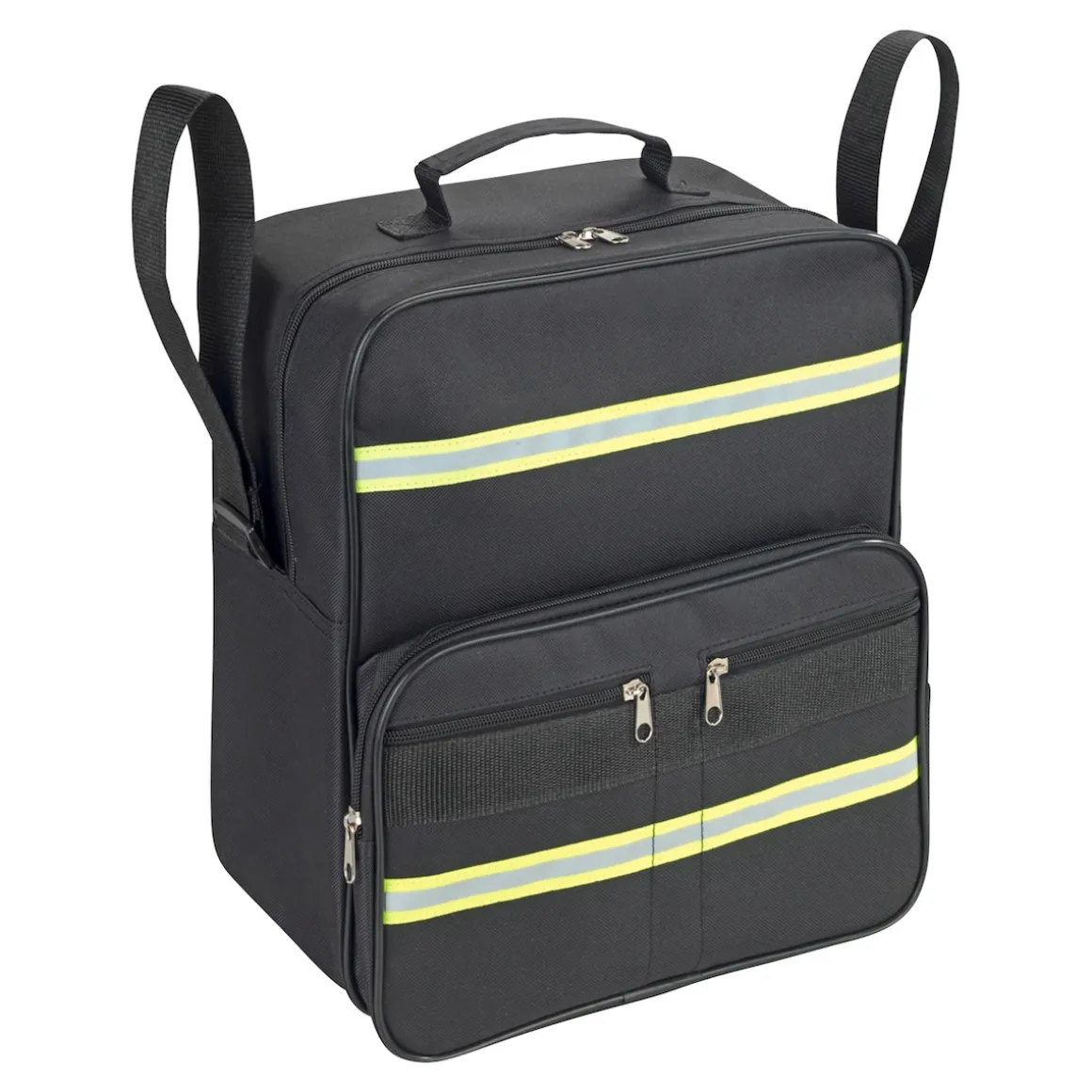 Geräumige, wetterfeste Tasche zur Befestigung am Rollstuhl oder Rollator. Mit Tragegriff und mehreren Reißverschlussfächern.