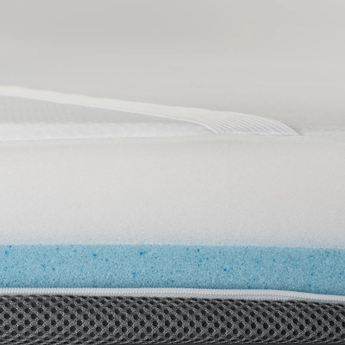 Das Geheimnis des eazzzy Toppers besteht in den zwei Schichten, aus denen er aufgebaut ist. Der Komfortschaum stützt die Wirbelsäule in ihrer gesamten Länge, das heißt vom Kopf bis zum Becken. Gleichzeitig bietet der anschmiegsame Gelschaum ergonomischen Liegekomfort, und zwar unabhängig von der Schlafposition. Das heißt, der Topper ist sowohl für Seiten- als auch Bauch- und Rückenschläfer geeignet. Wer unruhig schläft, profitiert von den bewegungsregulierenden Eigenschaften der Auflage, die mit ihrer Elastizität Schlafstörungen und Schmerzen vorbeugen kann. Mit der OptiAir-Steppung auf dem Bezug und dem Klimaband verbessert sich auch das Schlafklima, sodass Sie nachts weniger leicht schwitzen und somit auch im Sommer erholsamen Schlaf finden.