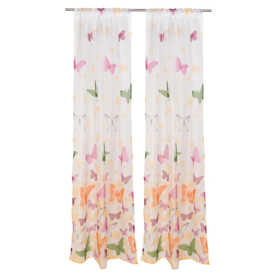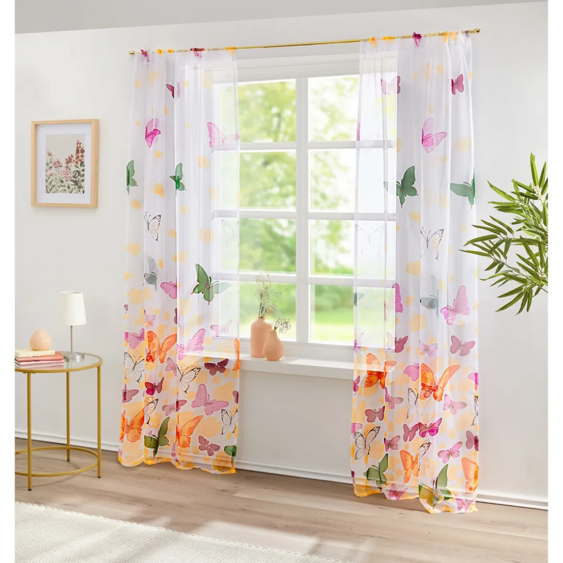 Der halbtransparente Vorhang lässt einen Schwarm zarter Schmetterlinge durch sonnendurchflutete Räume tanzen. Federleicht und frei flattern sie dahin – als wollten sie erzählen, wie schön das Leben ist. Ihre bloße Anwesenheit erfüllt Ihr Zuhause mit spürbarer Ruhe und Leichtigkeit.