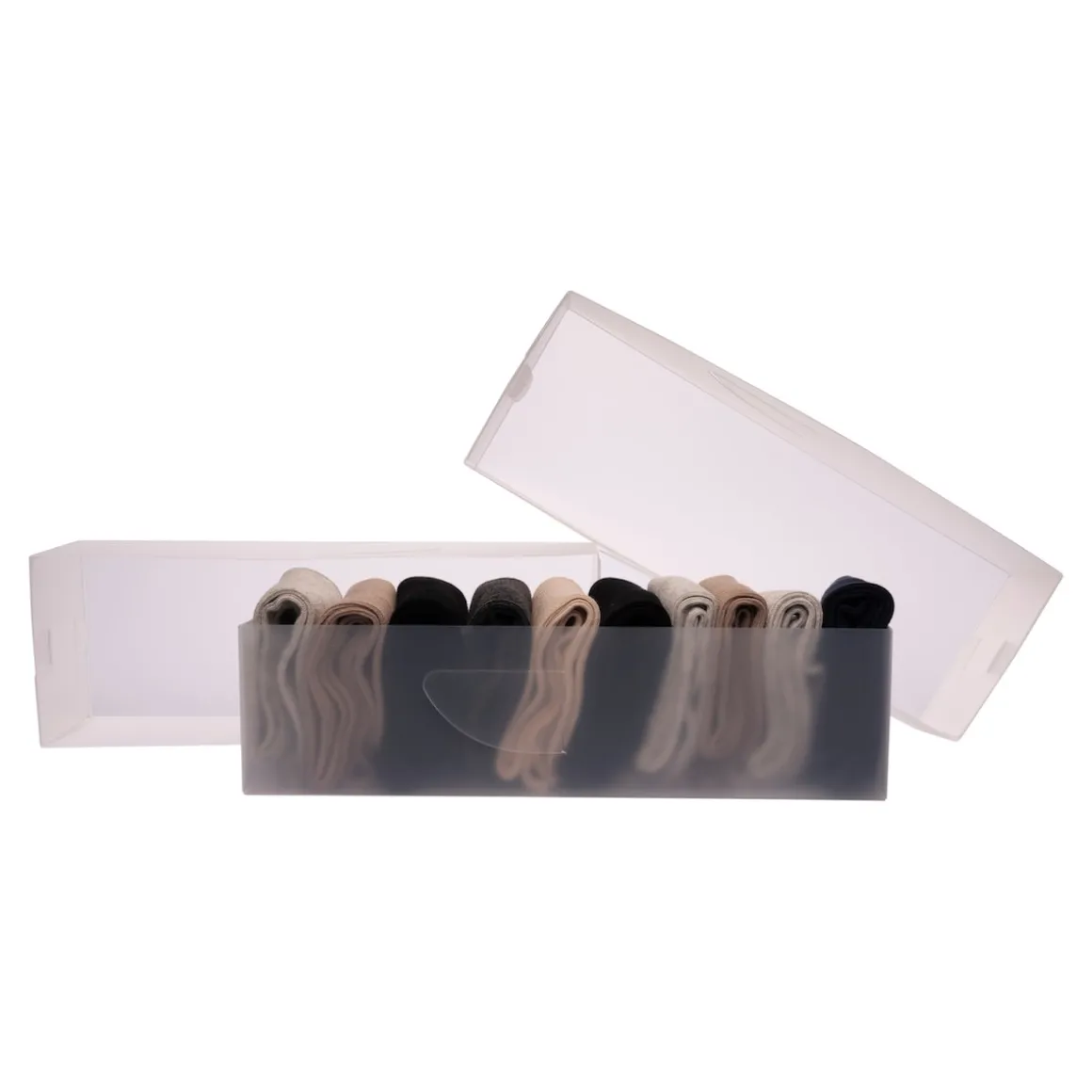 Wenn in der Socken- oder Unterwäsche-Schublade mal wieder Chaos herrscht, ist dieses dreiteilige Organizer-Set die ideale Lösung. Die faltbaren Kästchen aus einem leichten und halbtransparentem Kunststoff lassen sich wahlweise einzeln, zu zweit oder zu dritt nebeneinander in die Schublade stellen. Hier bieten sie viel Platz, um je nach Bedarf Socken, Strümpfe, Boxershorts, Slips oder BHs einzusortieren. Ob nach Farbe, Muster, Material, Wochentag oder nach Lust und Laune, ist dabei natürlich ganz den persönlichen Ordnungsvorlieben überlassen.