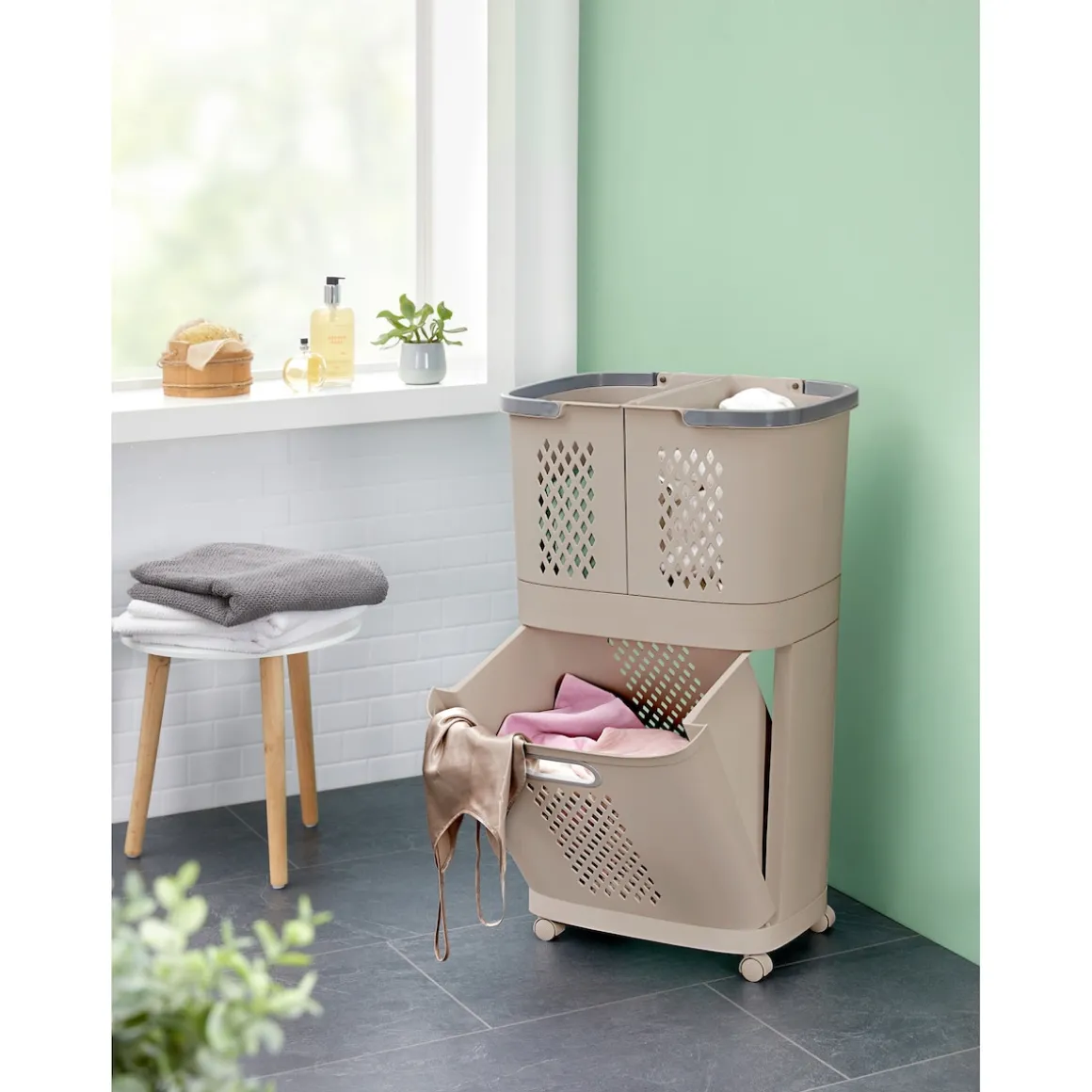 Mit unserem Wäschekorb-Organizer ‚3 in 1‘ wird Ordnung zum Kinderspiel! Dieses durchdachte System besteht aus drei einzeln entnehmbaren Körben, die perfekt zueinander passen. Unten befindet sich ein großer Korb auf Rollen mit einer praktischen Klappe an der Vorderseite. Oben finden Sie zwei weitere Körbe mit umklappbaren Henkeln. Diese können entweder auf dem Basiskorb stehen oder separat an Wand oder Schrank mithilfe der mitgelieferten Klebehaken befestigt werden. Dadurch eignen sie sich nicht nur für Wäsche, sondern auch für verschiedene Accessoires und Aufbewahrungsmöglichkeiten.