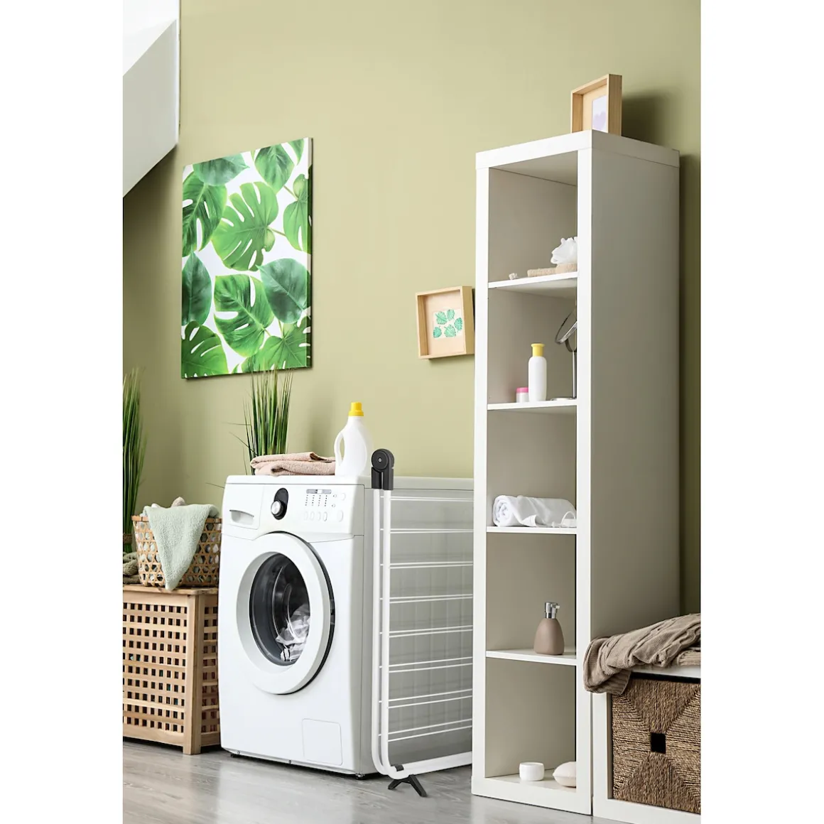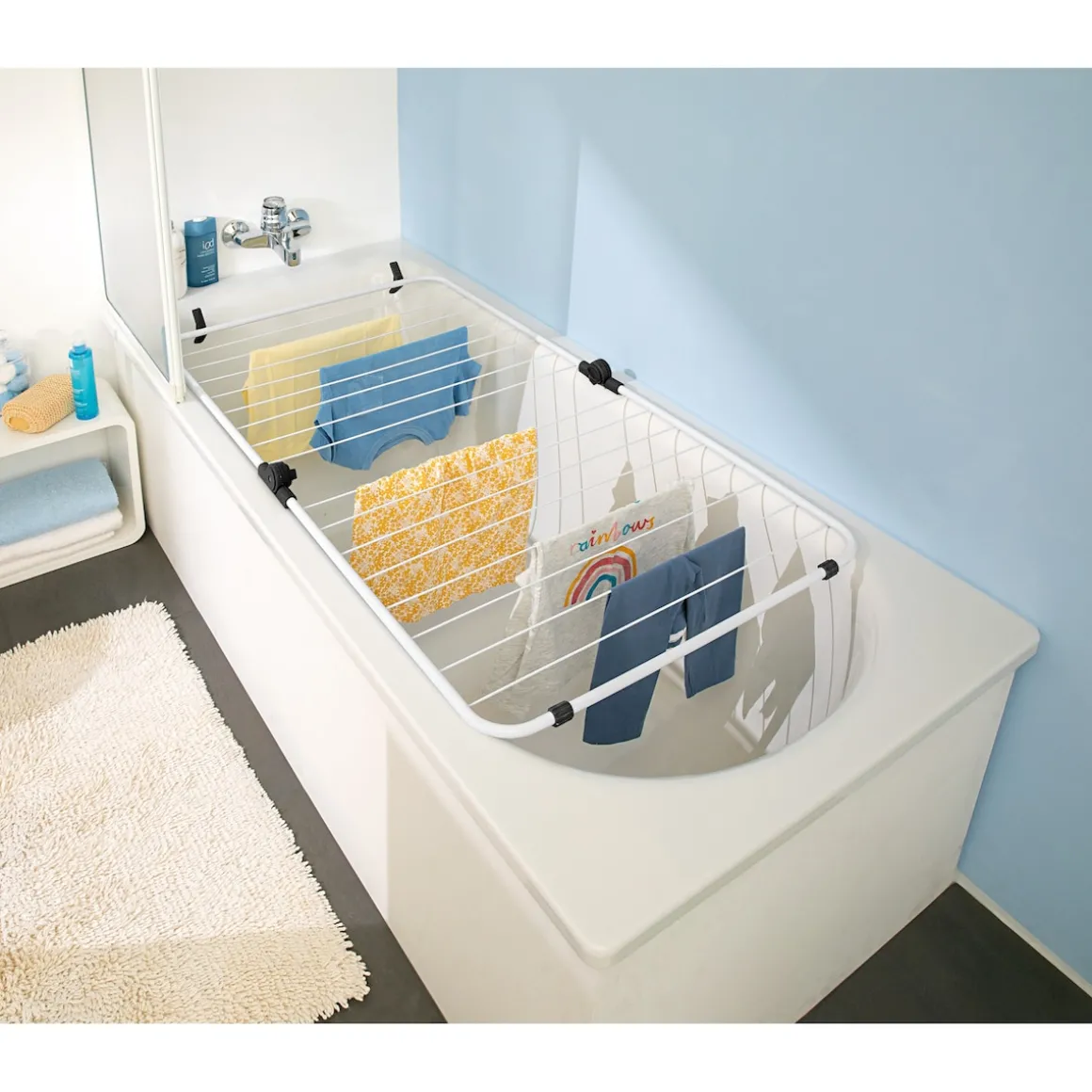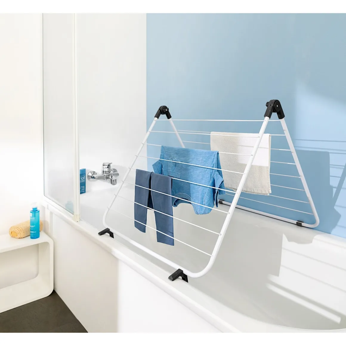 Dieser Wäschetrockner ist ein echtes Platz-Genie! Aufgeklappt bietet er als Trockenplatz über der Badewanne Raum für viel Wäsche. Nach Gebrauch kann er platzsparend zusammengeklappt werden. Praktisch: Durch seine Füßchen steht er selbstständig.