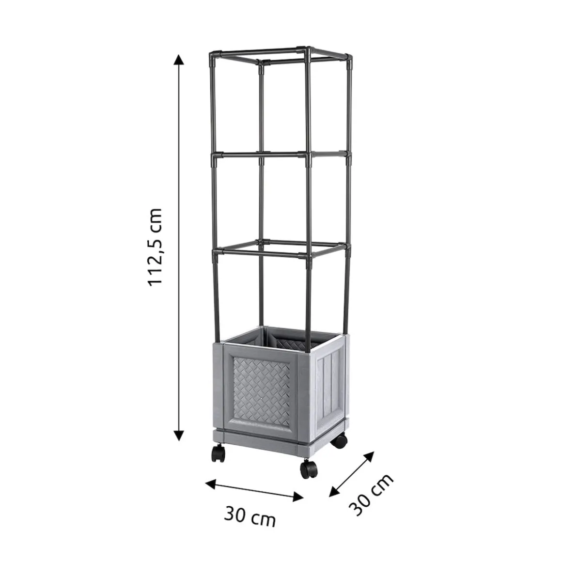 Abmessungen: Topf: (LxB) 30×30 cm, Höhe mit Rankgerüst: 112,5 cm