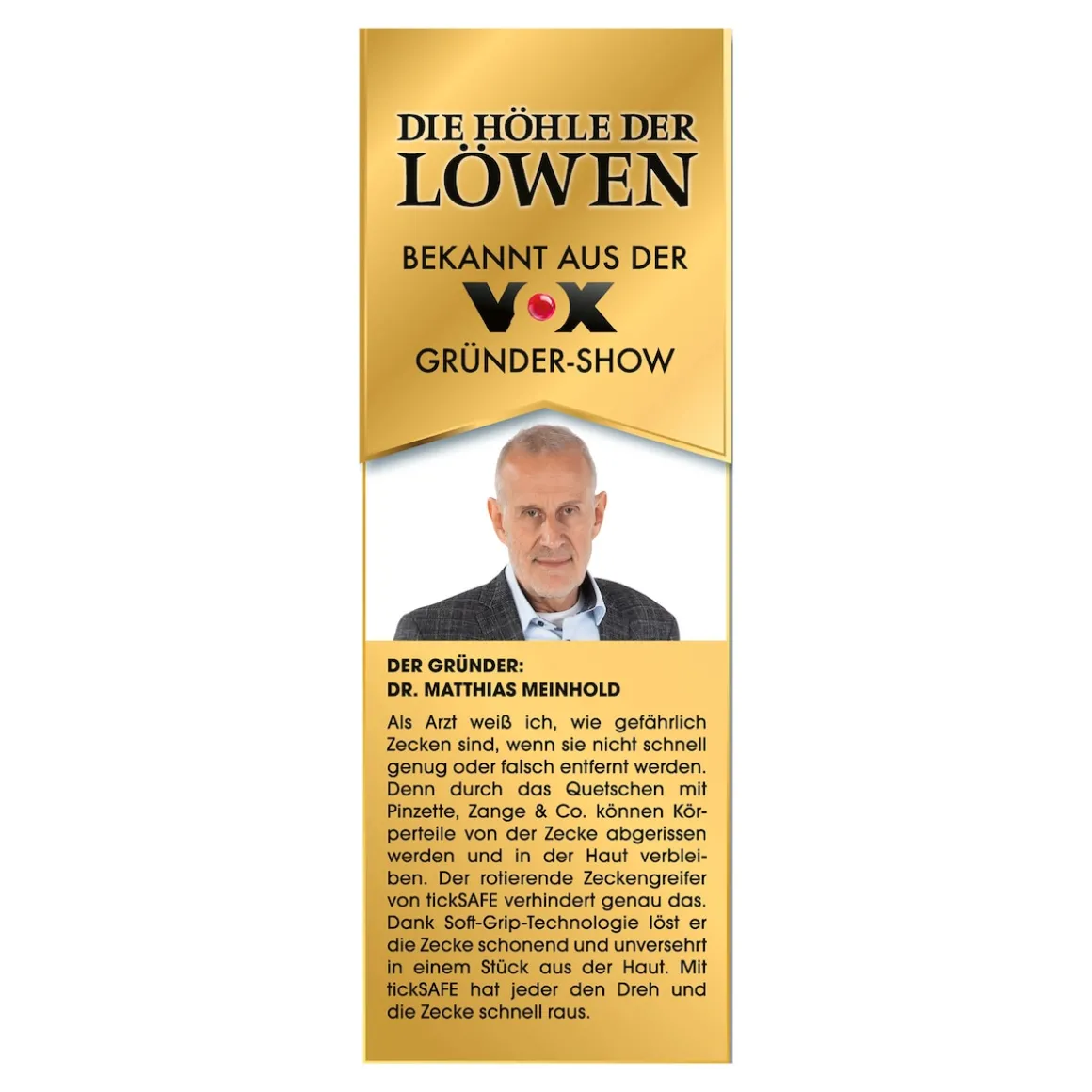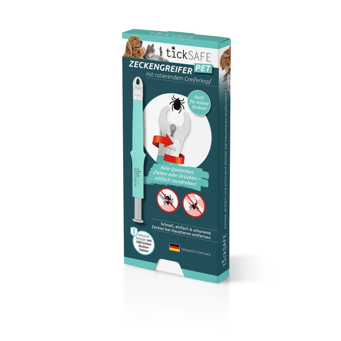 Zecken sind nicht nur lästig, sondern können auch für unsere Tiere gefährlich werden. Sie halten sich in Wäldern, Gräsern und Gebüschen auf – aber auch auf Stadtwiesen oder im Garten. Kurz gesagt: überall dort, wo sich Ihr Vierbeiner gerne aufhält. Umso wichtiger ist es, auf einen zuverlässigen Zeckenentferner zu setzen, der schnell und sicher hilft. Der tickSAFE Zeckengreifer Tier wurde speziell zur sanften und vollständigen Entfernung von Zecken entwickelt – und das ohne sie beim Herausziehen zu quetschen. Während starre Pinzetten oder Zeckenzangen die Zecke häufig verletzen, sorgt der flexible, rotierende Greiferkopf mit SoftGrip-Technologie dafür, dass die Zecke schonend erfasst und durch vorsichtiges Drehen sicher entfernt wird.